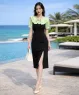 Đầm thun phối màu cổ bèo xẻ tà trước